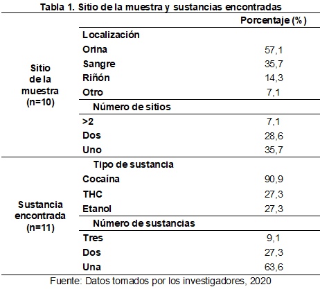 Por otro lado, en 11 registros se describió la sustancia encontrada, siendo la más frecuente la cocaína en 90,9% de los casos, mientras que el THC y el etanol estuvieron en 27,3% cada uno, y como se describe en el párrafo anterior, varios casos tuvieron más de una sustancia: 36,4% de los 11 casos que contaban con esta información (Tabla 1).