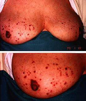 Mujer de 74 años de edad a la que se le atiende en interconsulta por presentar lesiones purpúreas de 15 meses de evolución localizadas en ambas mamas que adoptaban una forma en llamarada y que afectaban al pezón y a la areola (figura 1). La paciente refirió que se habían iniciado y desarrollado de forma progresiva en ambas mamas y que dada la ausencia de dolor y de supuración por los pezones no sintió la necesidad de consultarlo. El cuadro clínico se acompañaba desde hacía un año de anorexia y pérdida de peso de 20 Kg. Quince días antes de su ingreso comenzó con disnea que se hizo progresiva, motivo por el que acudió a Urgencias.