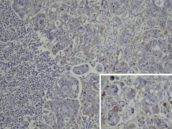 EGFR positivo en las células tumorales (EGFR-p). Recuadro: detalle