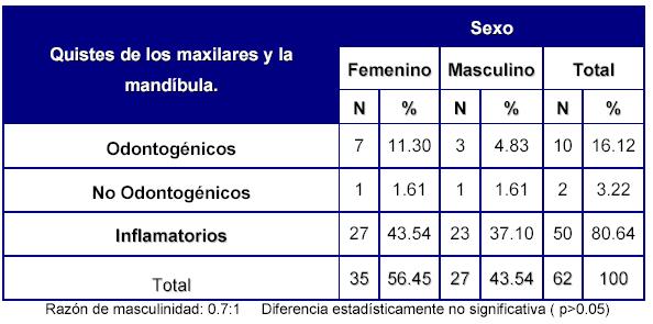 De los 62 casos de quistes 50 (82.64%) eran inflamatorios y de ellos el radicular apical tuvo el mayor registro con 35 casos; el sexo femenino fue el más afectado aunque no significativamente (p>0.05); se reportó mayor frecuencia entre la segunda y quinta década de la vida, siendo más notable en el grupo de 31-40 años (25.80%); en cuanto a la localización los maxilares abarcaron el 74.19% frente a los mandibulares (p<0.05).