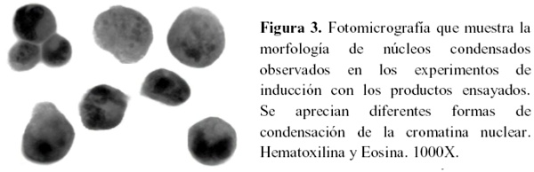 Resultados: se evidenció por primera vez las variaciones morfofuncionales ocasionadas en un modelo celular in vitro por los productos ensayados y se mostraron las marcas moleculares y morfológicas más utilizadas en la actualidad para confirmar la inducción de una muerte celular programada o apoptosis.