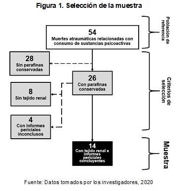 Se incluyeron todos los casos positivos para sustancias como cocaína y THC, (se consideró incluir heroína o metanfetamina pero ningún caso cumplió con este criterio) en orina o en sangre, registrados en el laboratorio de química usando las bases de datos del INML. Todos estos datos fueron analizaron retrospectivamente usando la autorización de las autoridades judiciales. Se intentó recuperar la mayor cantidad de información posible acerca del sujeto, sin embargo, por motivos de antigüedad de algunas muestras, esto no fue siempre posible. Un total de 54 muertes atraumáticas relacionadas con cocaína y THC fueron documentadas, de las cuales 26 tenían conservadas parafinas de múltiples órganos. De estas, 8 no tenían tejido renal, 4 aparecían con informes periciales inconclusos, por lo que las muestras resultantes fueron finalmente pertenecientes a 14 casos. Esta labor fue llevada a cabo por un grupo de médicos y químicos farmacéuticos autorizados y delegados por el INMLCF. Por otra parte, con la ayuda de los patólogos se hizo la búsqueda de las muestras de riñón de tales incisos, las cuales luego se trasladaron al laboratorio de patología de La Clínica de la Costa, donde se realizó la lectura histológica de dichas muestras, y la descripción de sus hallazgos (Figura 1).