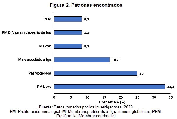 La proliferación mesangial leve fue el patrón más común, presente en 33,3% de los casos, seguido por la proliferación mesangial moderada (25%), siendo el patrón membranoproliferativo no asociado a inmunoglobulinas (16,7%) (Figura 2).