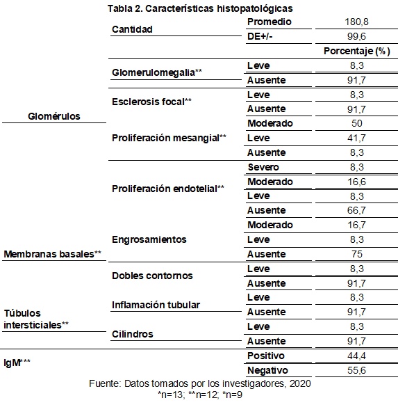 En cuanto a las características histopatológicas, 13 casos tenían información sobre el número de glomérulos, siendo el promedio de 180,8 (DE±: 99,6) glomérulos por sujeto. El resto de las variables relacionadas con glomérulos hacen referencia a 12 casos con información sobre cada una de ellas, observándose que 8,3% tenían leve glomerulomegalia, y esclerosis focal. En cuanto a la proliferación mesangial, 50% tenían un grado moderado y 41,7% un grado leve. Asimismo, 8,3% tenían proliferación endotelial severa, 16,6% moderada y 8,3% leve (Tabla 2).