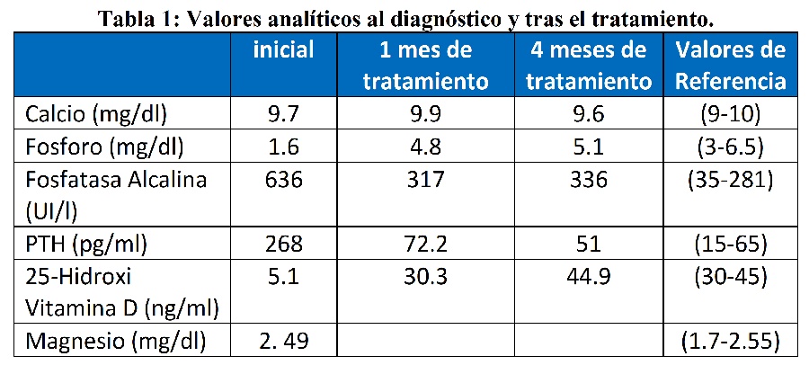 Se completó el estudio con una analítica sanguínea, objetivando datos claros de raquitismo carencial (Tabla 1).