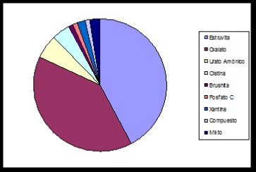La mayoría de los 517 urolitos de la especie canina analizados eran de estruvita (42.3%) y de oxalato de calcio (39.6%). El resto de composiciones químicas encontradas fueron: urato amónico (5.8%), cistina (4%), xantina (2%), brushita (fosfato cálcico dihidratado) (1.2%) y fosfato de calcio (1.2%), junto con cálculos mixtos (2%) y cálculos compuestos (1%), figuras 1-3.