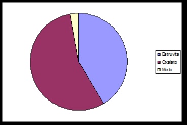 En perros, los cálculos más frecuentes fueron los de estruvita (42.3%), seguidos por oxalato cálcico (39.6%), urato amónico (5.8%), cistina (4%), xantina (2%), brushita (1.2%) y fosfato de calcio (1.2%). Los cálculos mixtos representaron el 2%, mientras que los compuestos fueron el 1%.